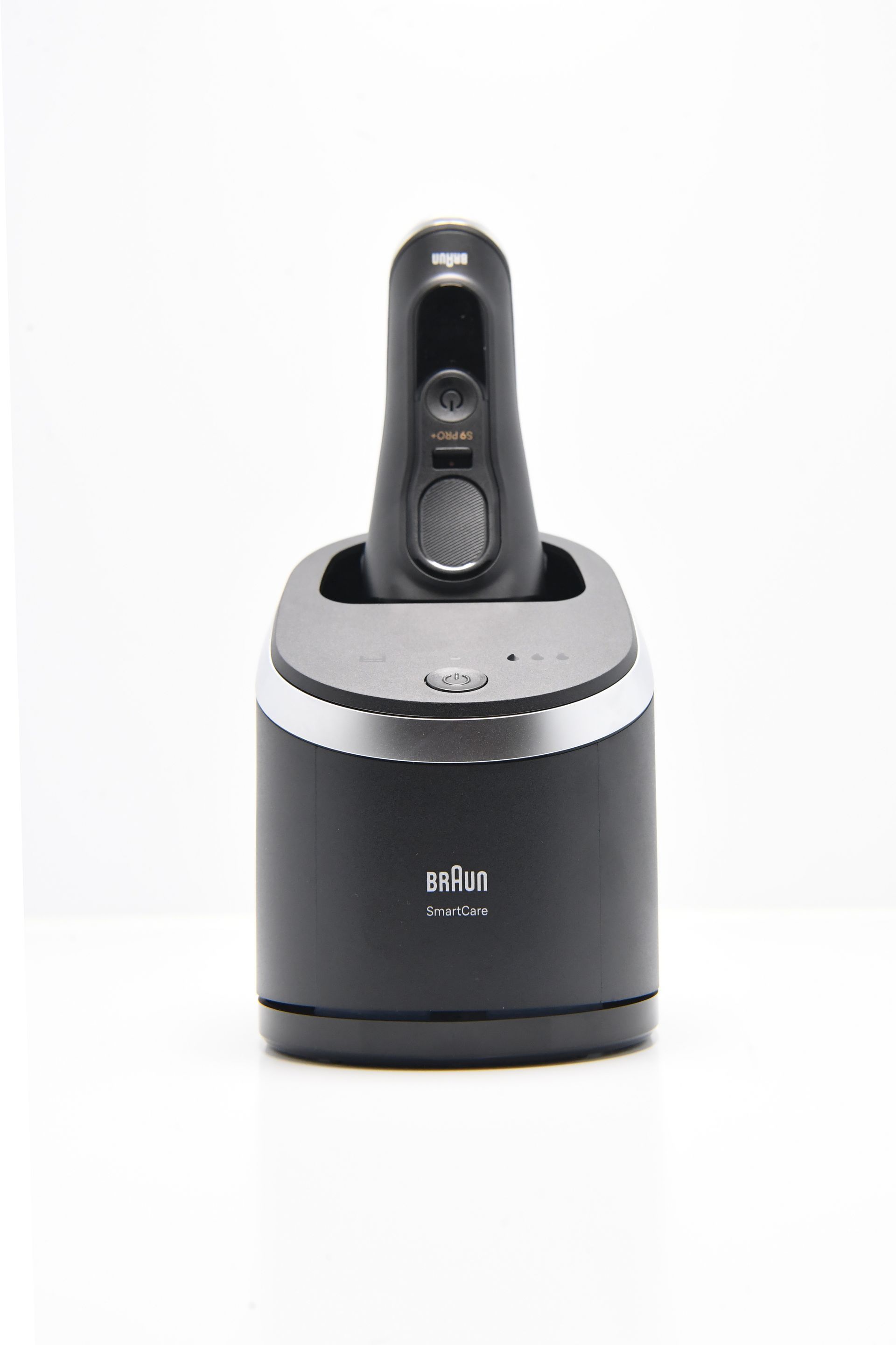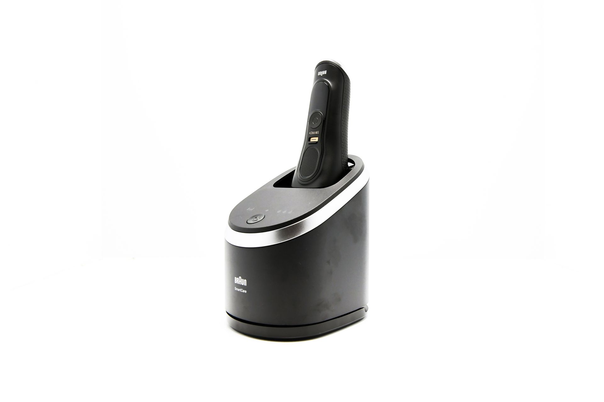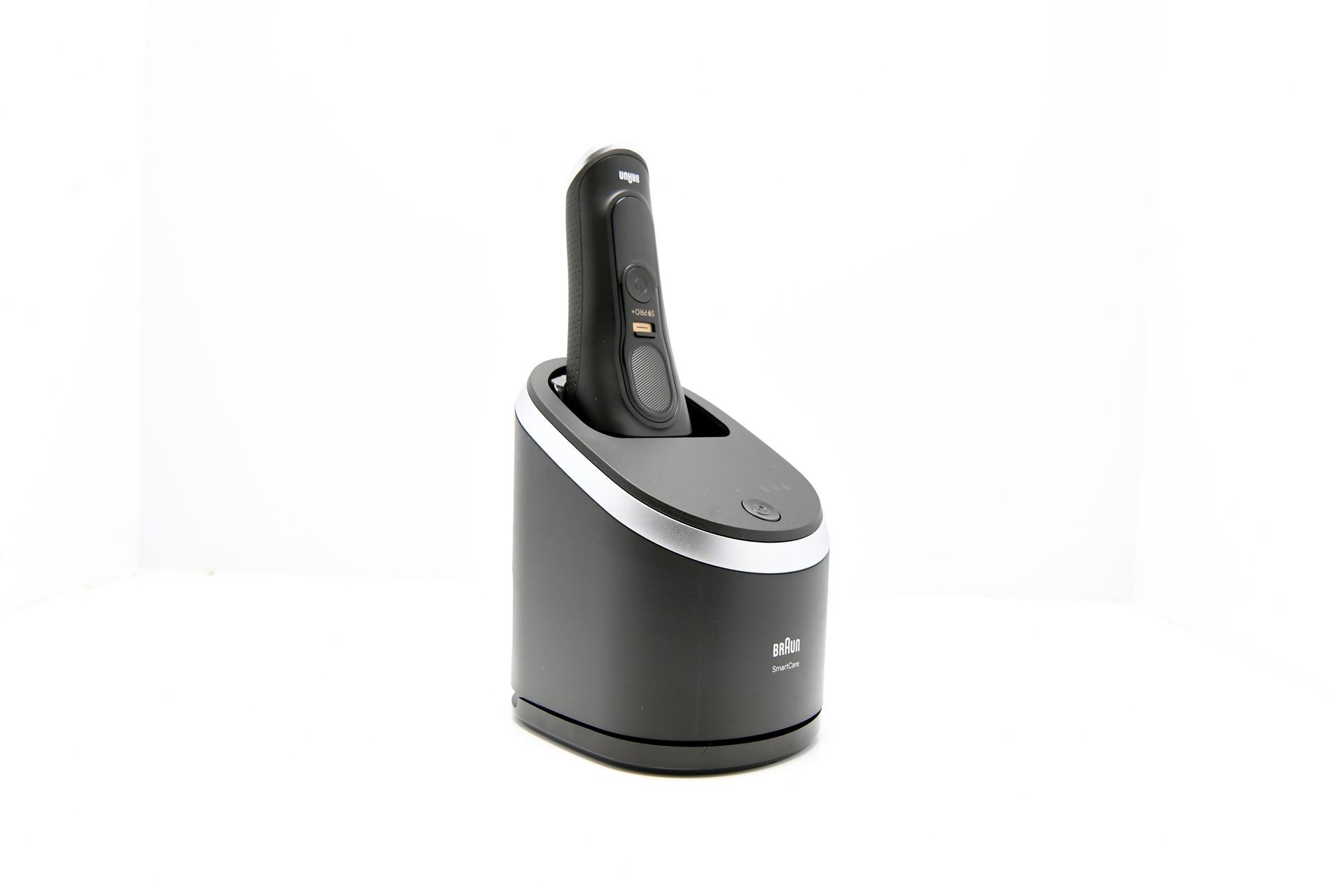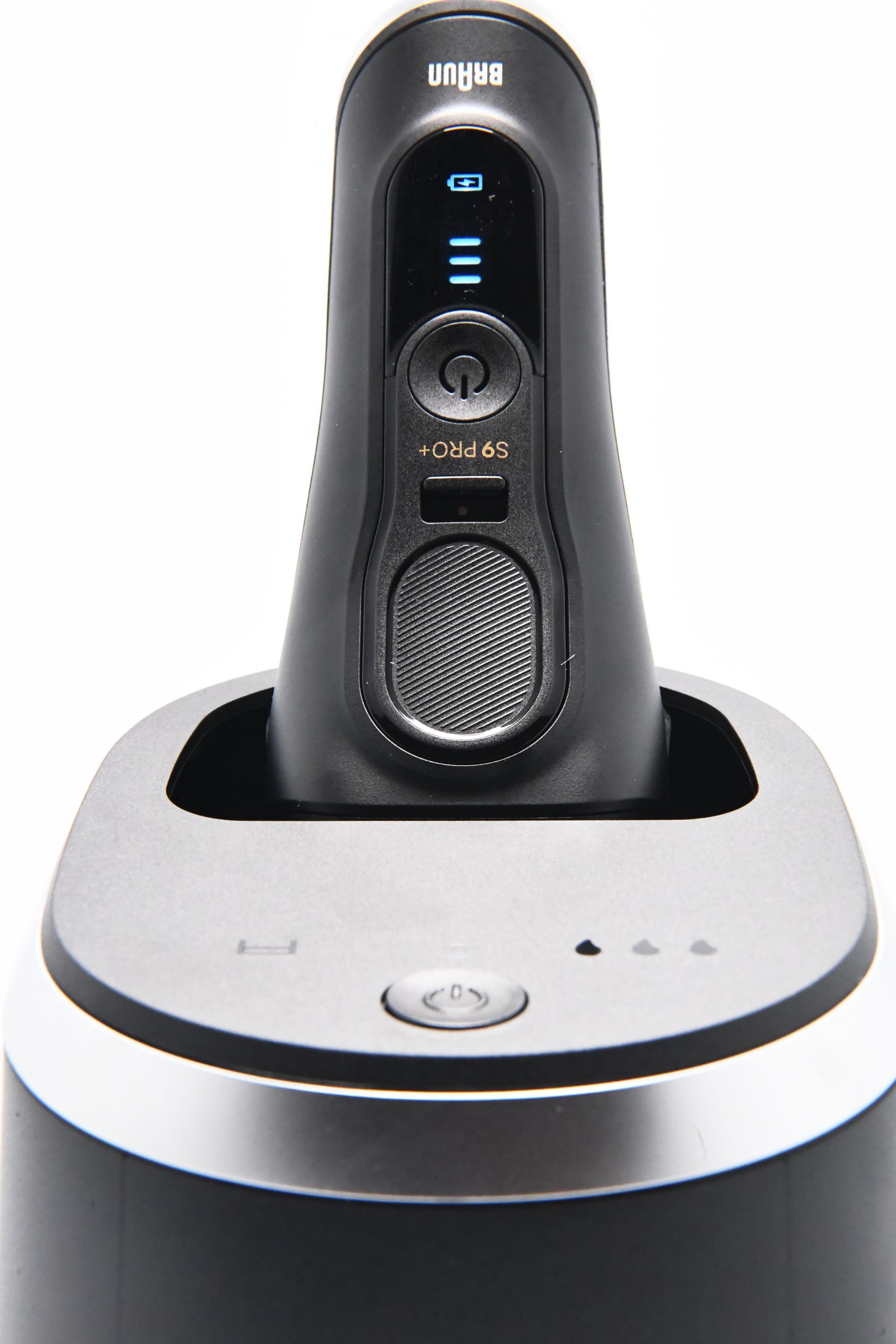 Ein weiteres herausragendes Feature des Braun Series 9 Pro + ist die zugehörige Lade- und Reinigungsstation. Diese ist in einem modernen, schlichten Design gehalten, mit einer schwarzen, matten Oberfläche und silbernen Applikationen, die einem gebürsteten Metall ähneln. Die Station erfüllt gleich zwei Funktionen: Sie lädt den Rasierer und sorgt gleichzeitig für eine hygienische Reinigung des Scherkopfs. Dabei wird der Rasierer kopfüber in die Station eingesetzt, wodurch er sicher aufgeladen wird.
