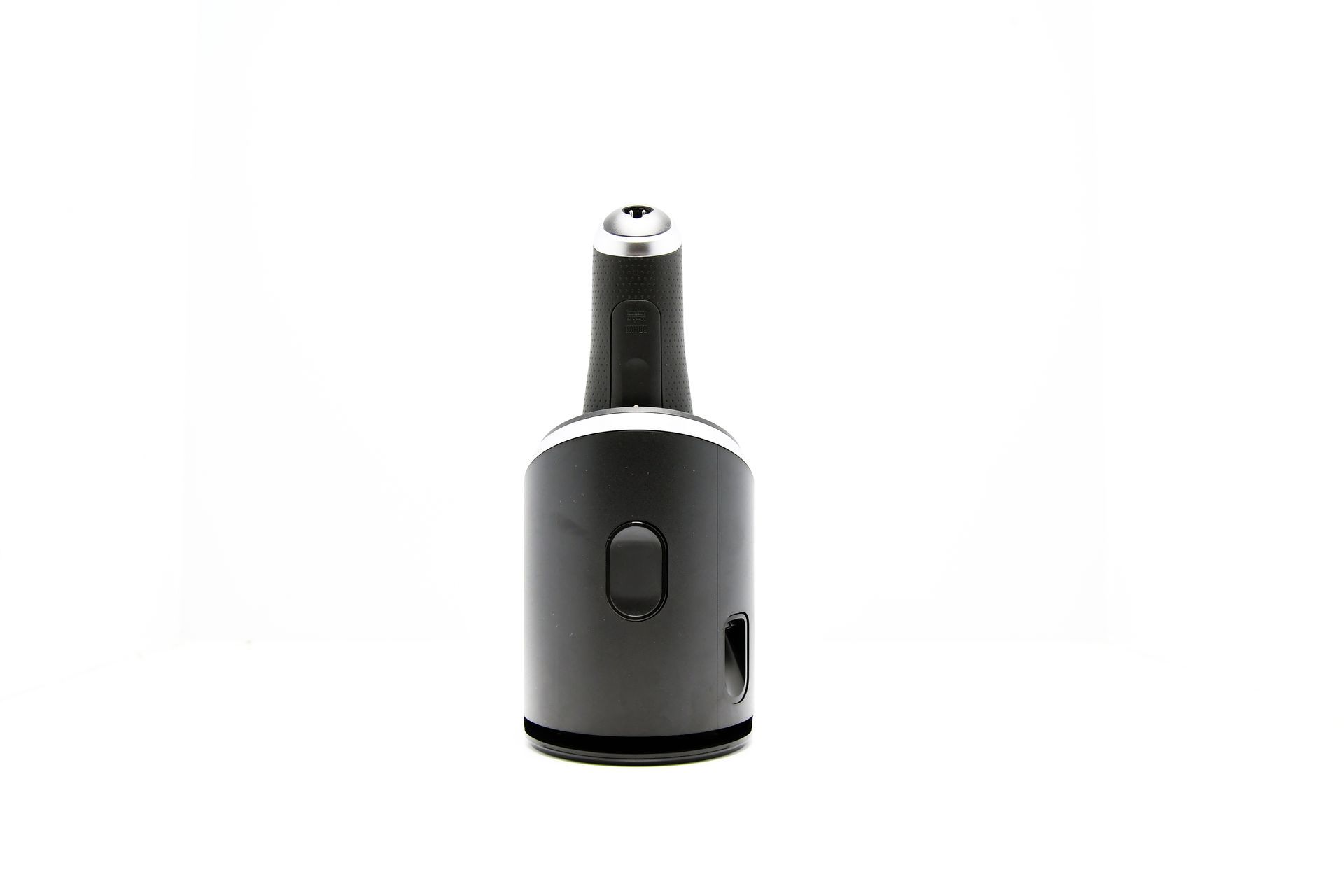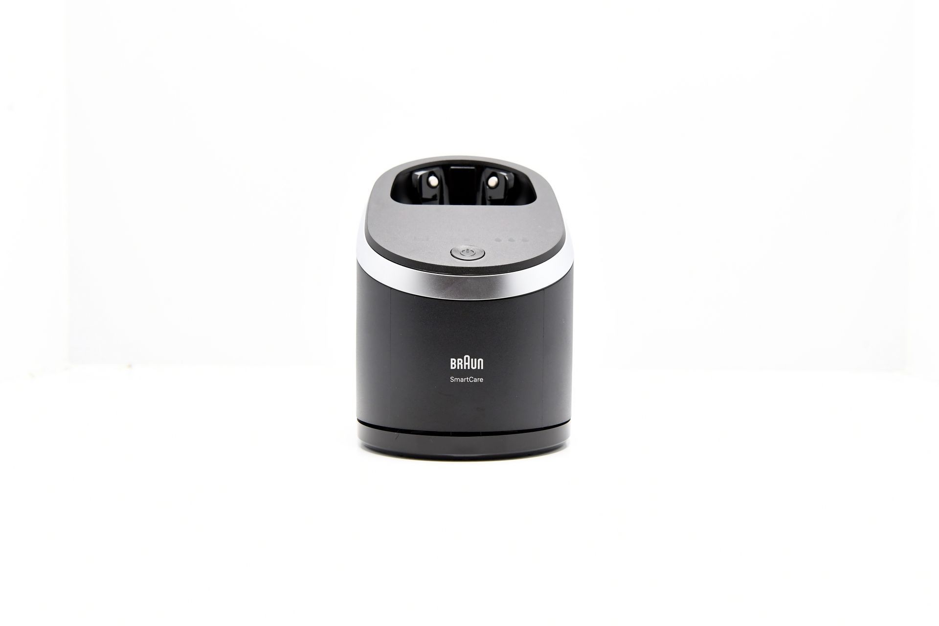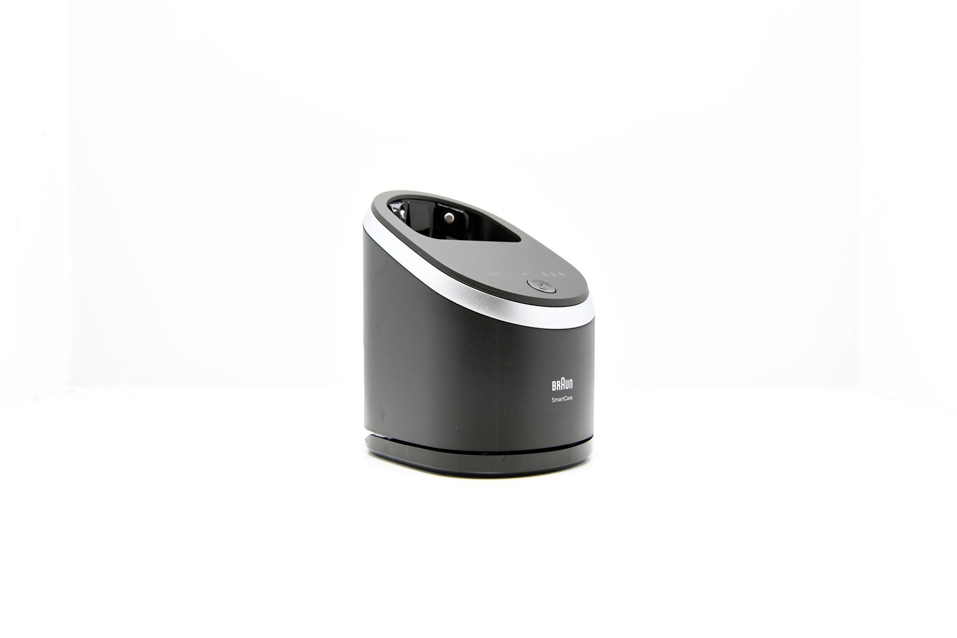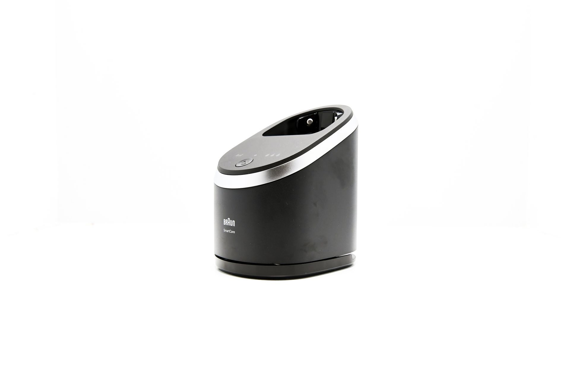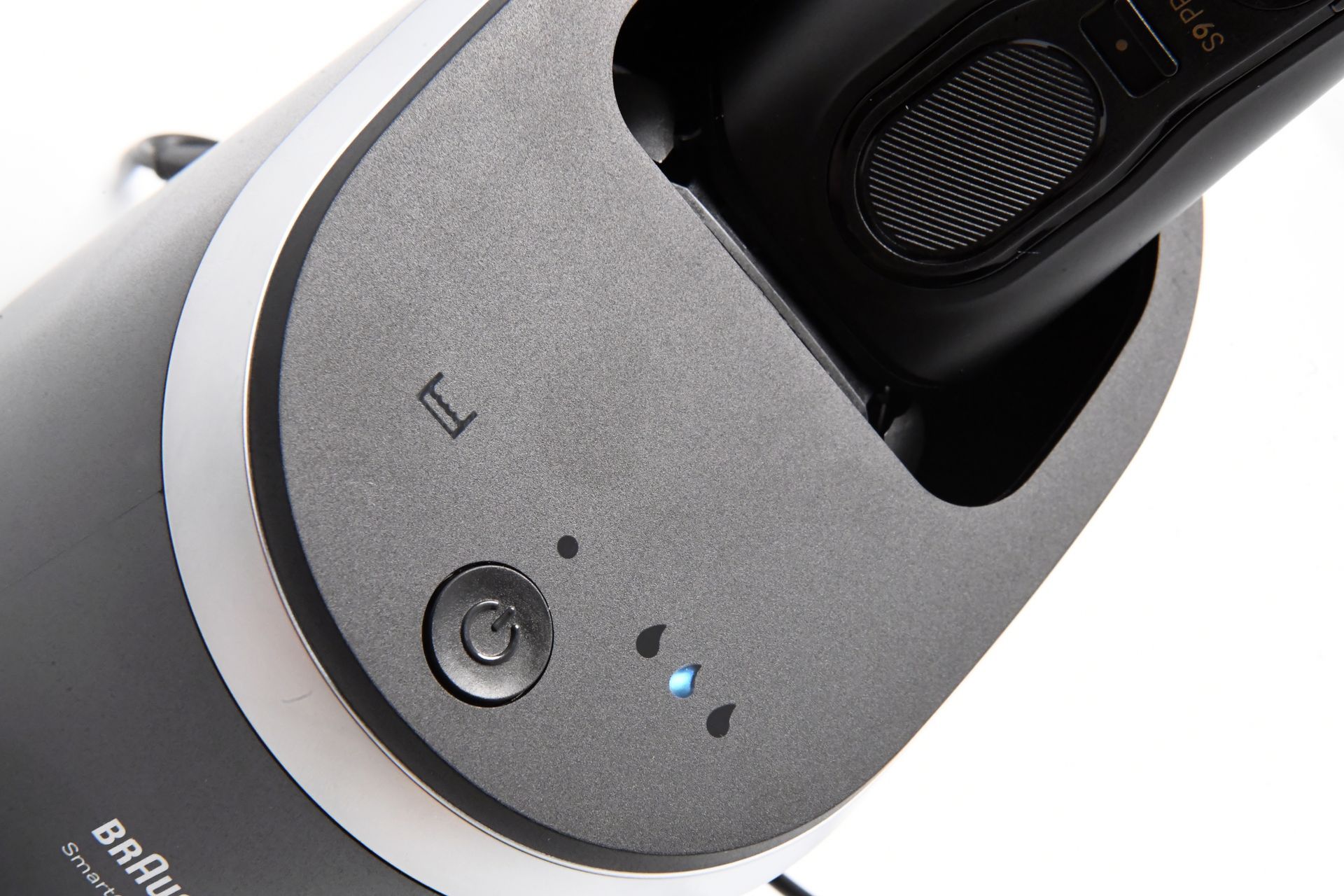 Ein weiteres herausragendes Feature des Braun Series 9 Pro + ist die zugehörige Lade- und Reinigungsstation. Diese ist in einem modernen, schlichten Design gehalten, mit einer schwarzen, matten Oberfläche und silbernen Applikationen, die einem gebürsteten Metall ähneln. Die Station erfüllt gleich zwei Funktionen: Sie lädt den Rasierer und sorgt gleichzeitig für eine hygienische Reinigung des Scherkopfs. Dabei wird der Rasierer kopfüber in die Station eingesetzt, wodurch er sicher aufgeladen wird.