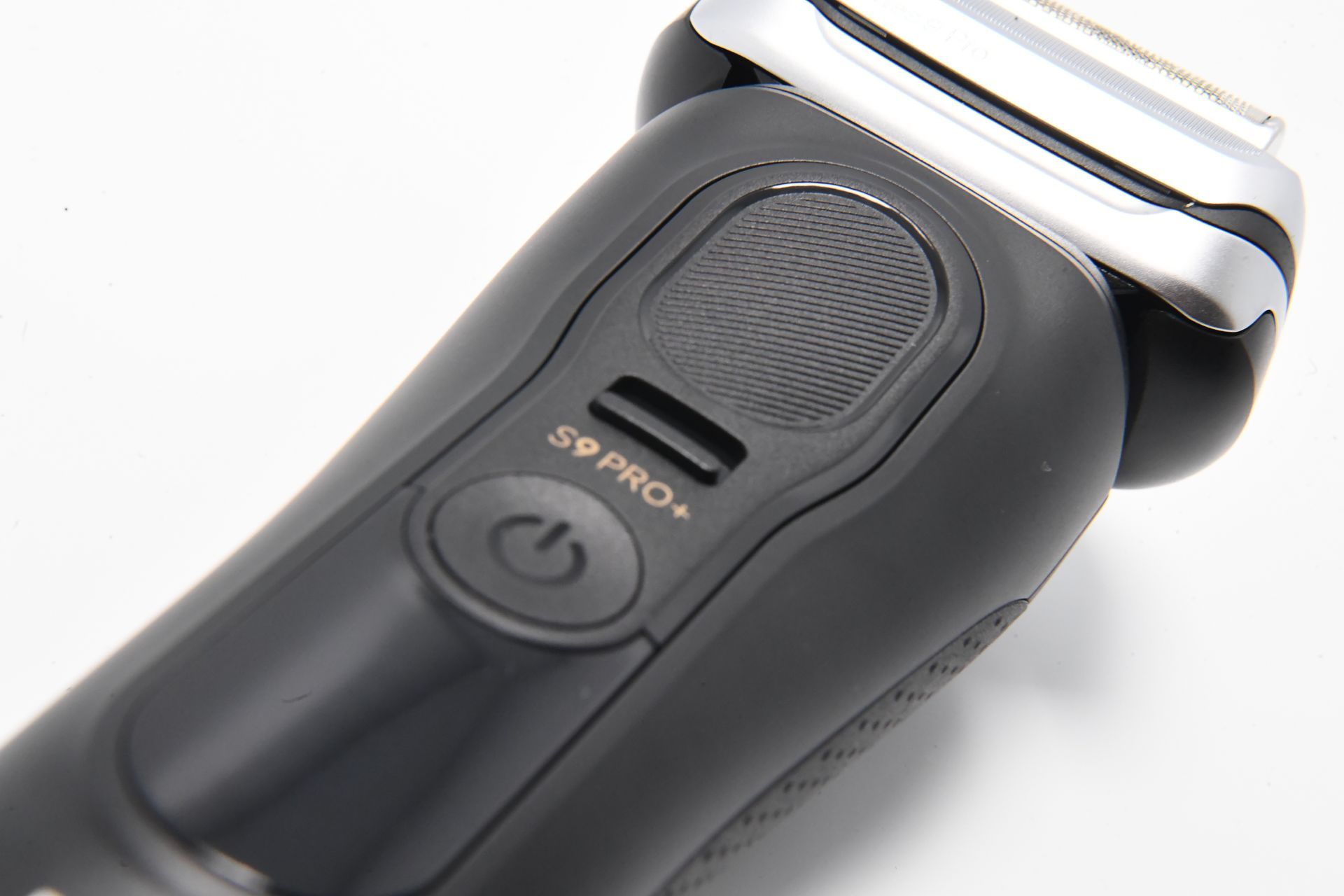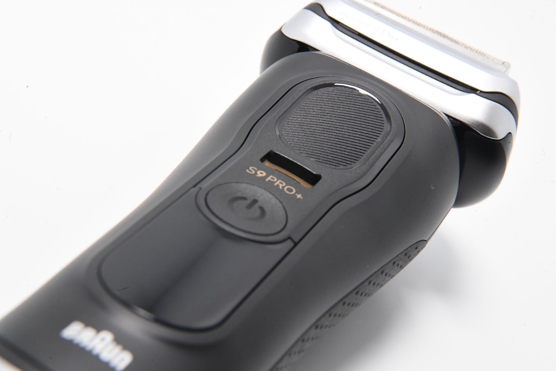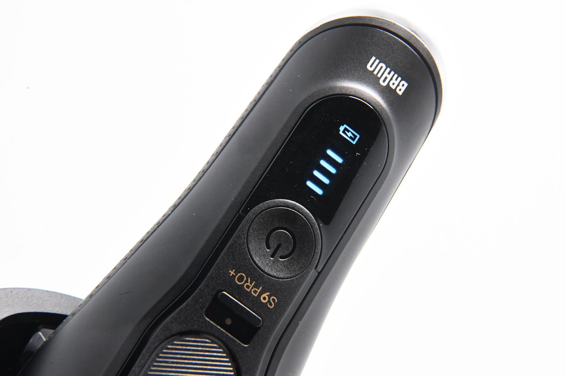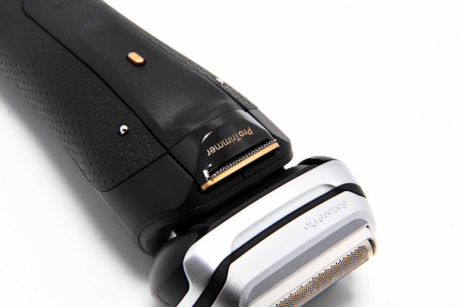 Das Design des Braun Series 9 Pro + Rasierers ist ebenfalls beeindruckend. Der Rasierer ist in einem eleganten, matten Schwarz gehalten, das mit gold- und silberfarbenen Akzenten veredelt wurde. Das Daumen-große LED-Display auf der Vorderseite zeigt während des Ladevorgangs und der Rasur den Akkustand an. Direkt darunter befindet sich der Betriebsschalter, der mit einem leichten Fingerdruck einfach betätigt werden kann.