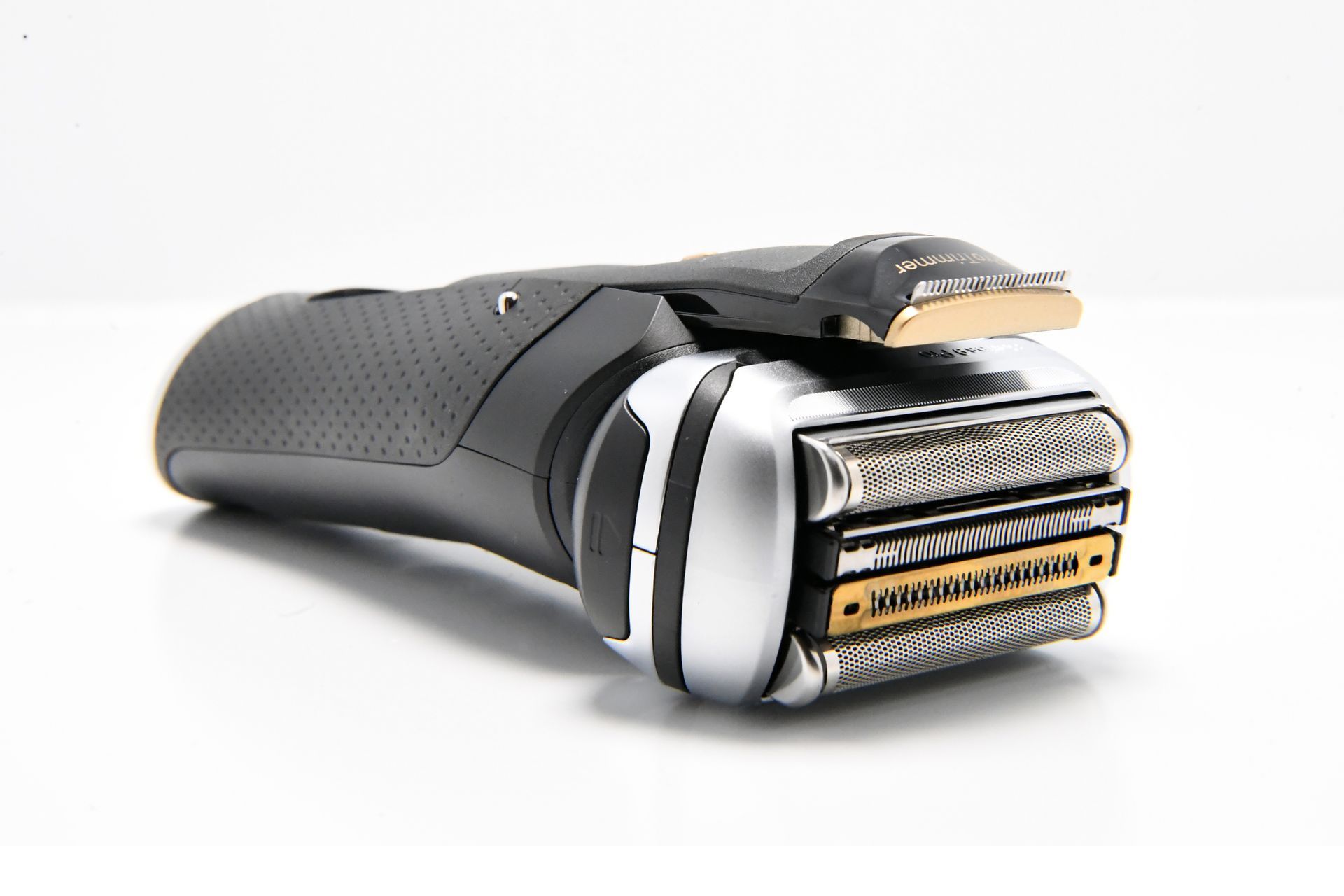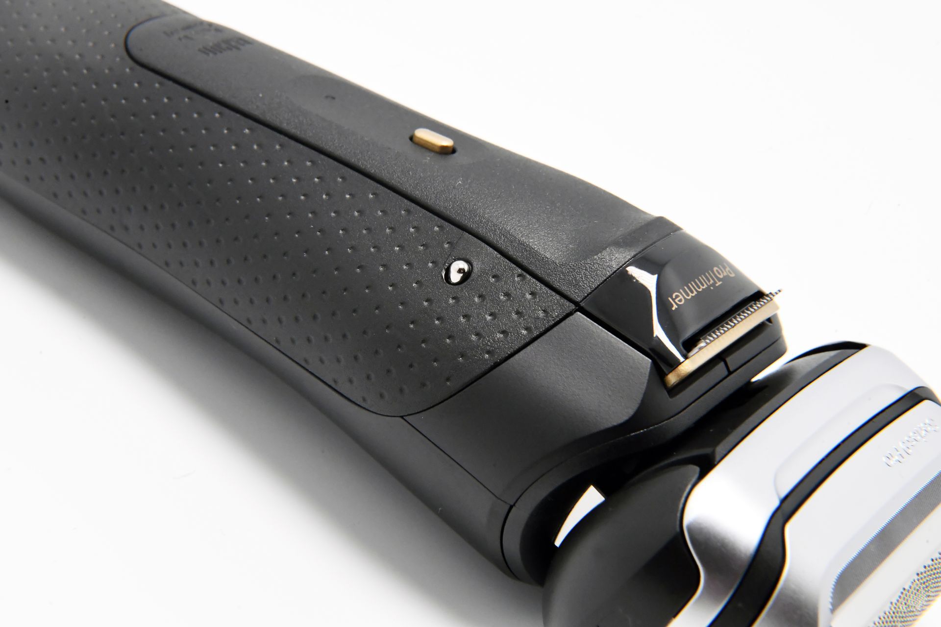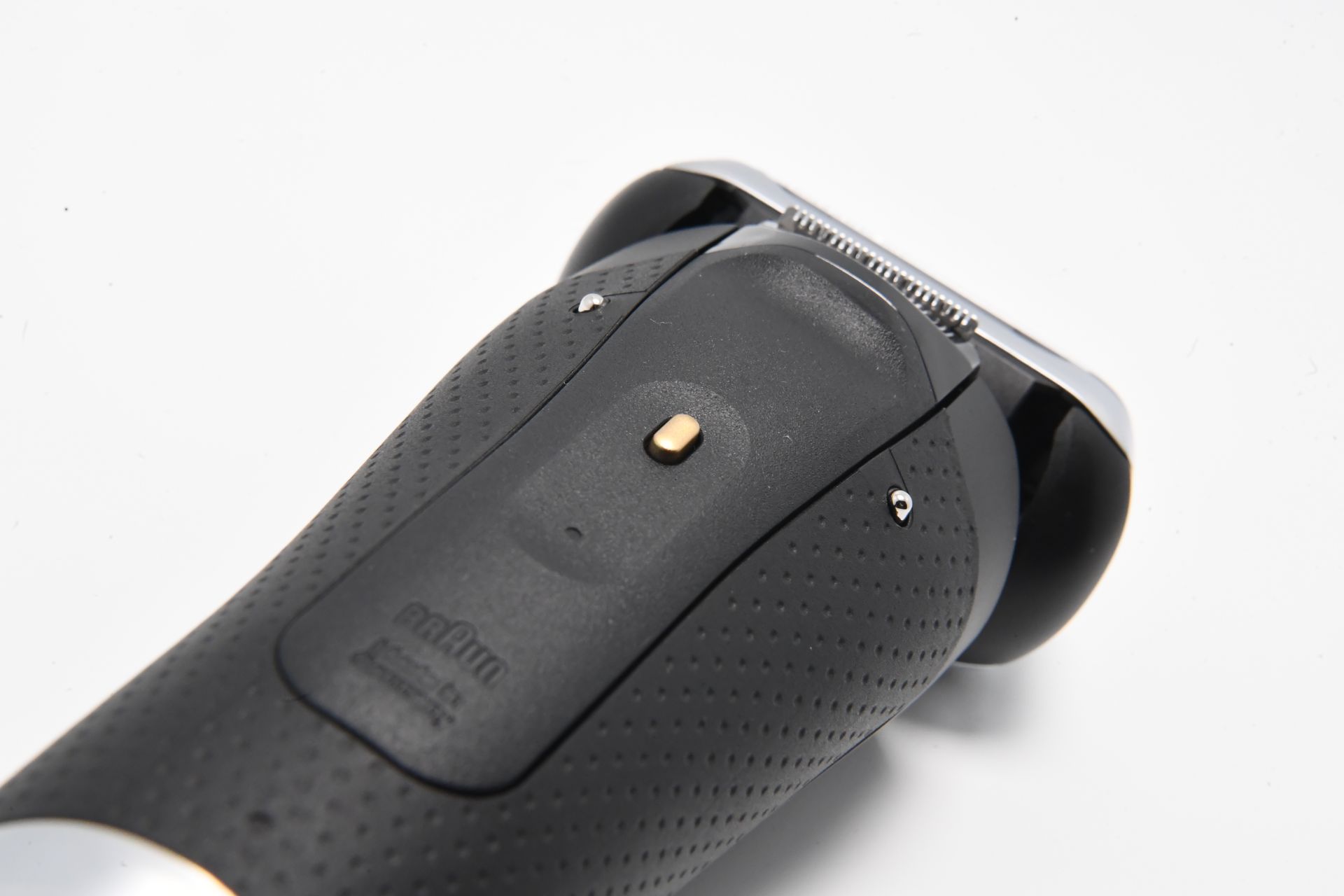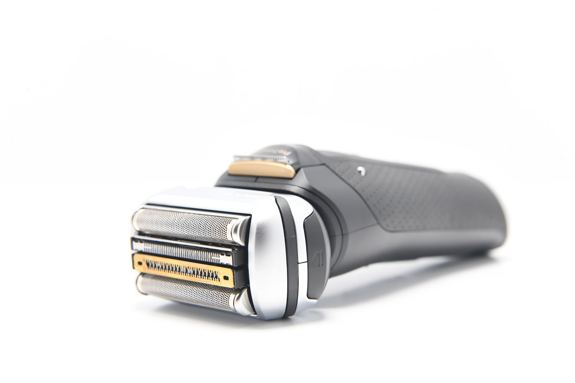 Das Design des Braun Series 9 Pro + Rasierers ist ebenfalls beeindruckend. Der Rasierer ist in einem eleganten, matten Schwarz gehalten, das mit gold- und silberfarbenen Akzenten veredelt wurde. Das Daumen-große LED-Display auf der Vorderseite zeigt während des Ladevorgangs und der Rasur den Akkustand an. Direkt darunter befindet sich der Betriebsschalter, der mit einem leichten Fingerdruck einfach betätigt werden kann.