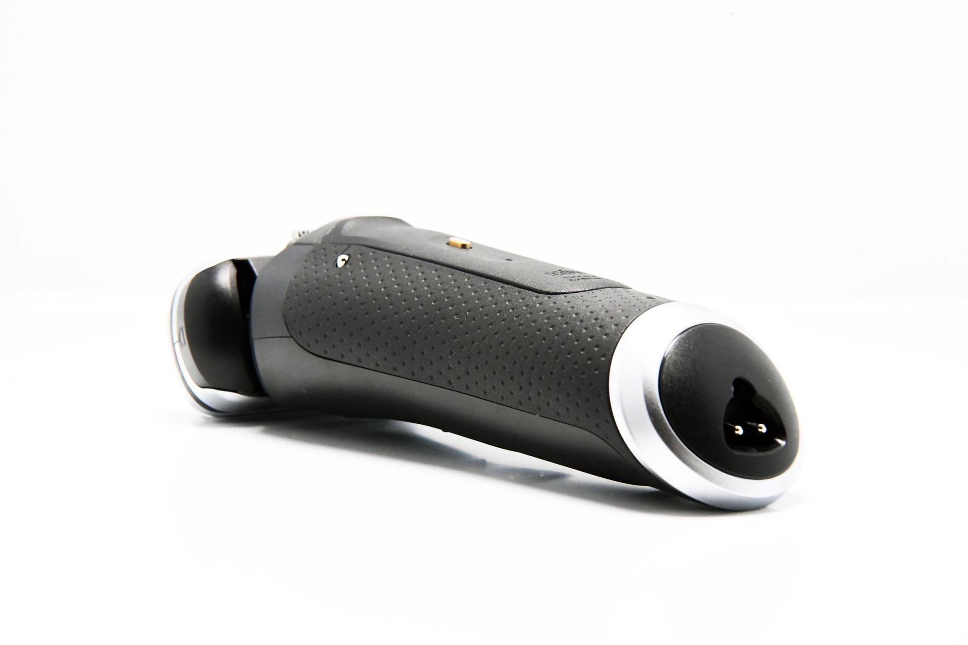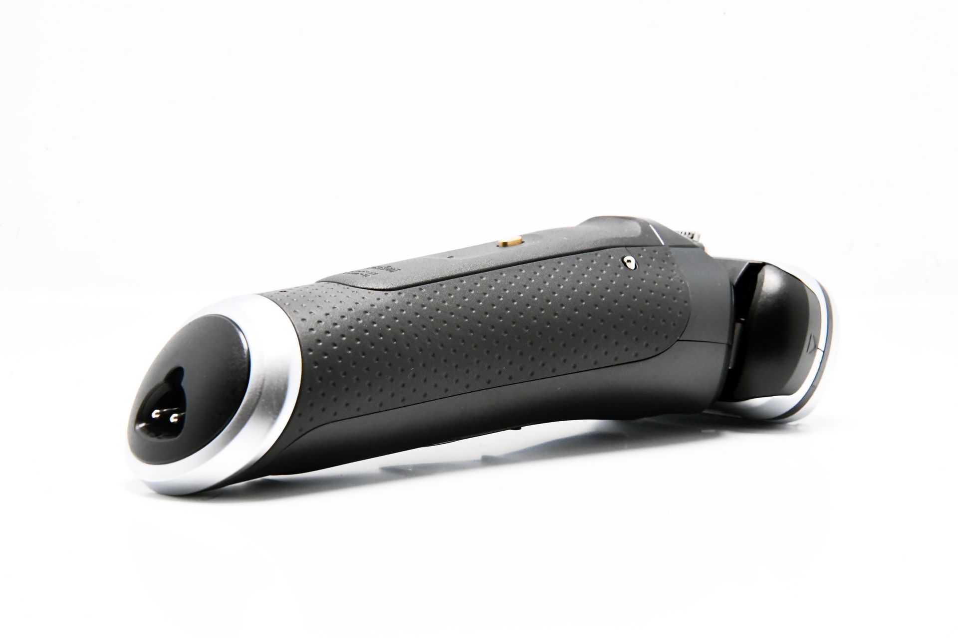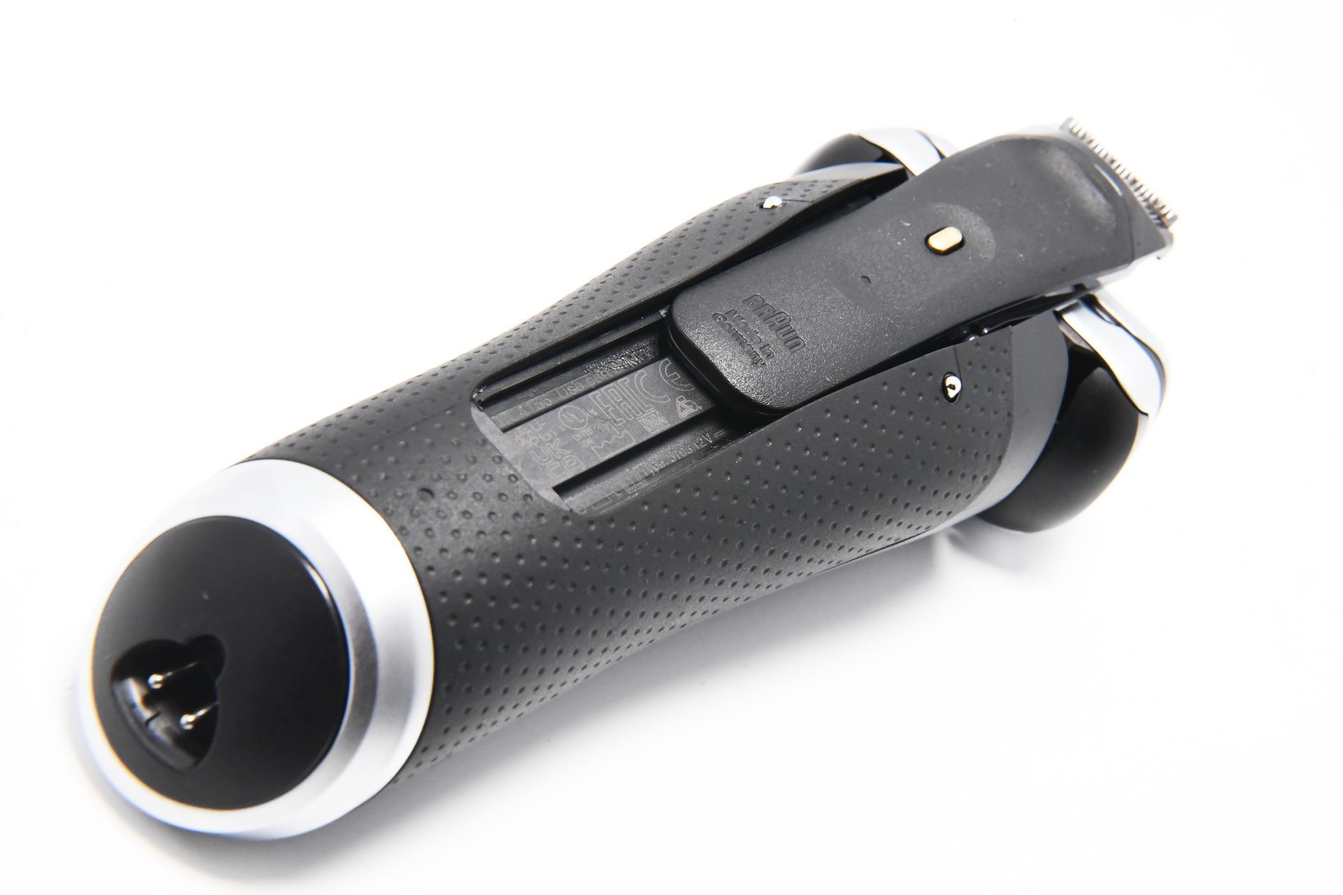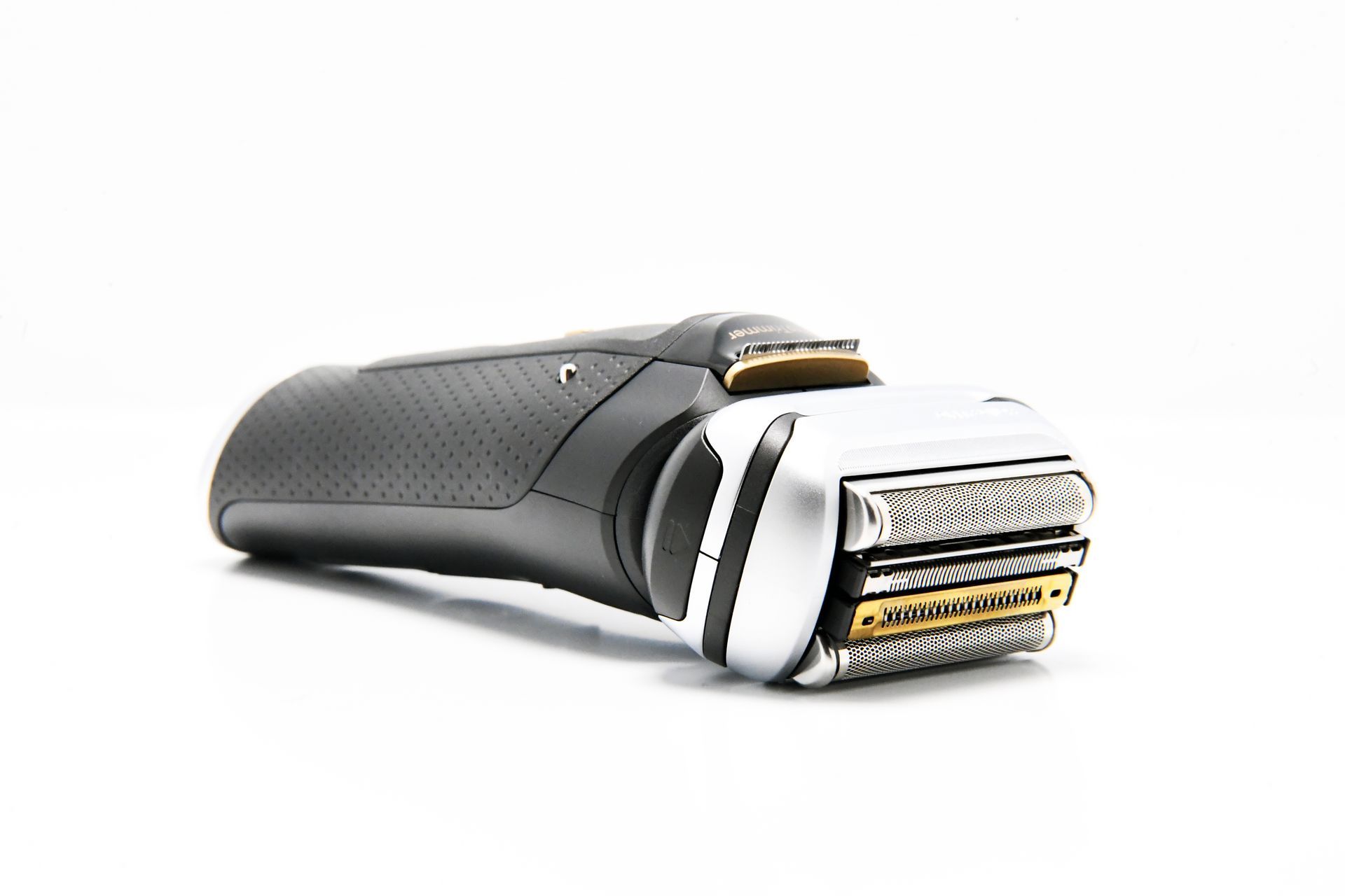 Das Design des Braun Series 9 Pro + Rasierers ist ebenfalls beeindruckend. Der Rasierer ist in einem eleganten, matten Schwarz gehalten, das mit gold- und silberfarbenen Akzenten veredelt wurde. Das Daumen-große LED-Display auf der Vorderseite zeigt während des Ladevorgangs und der Rasur den Akkustand an. Direkt darunter befindet sich der Betriebsschalter, der mit einem leichten Fingerdruck einfach betätigt werden kann.