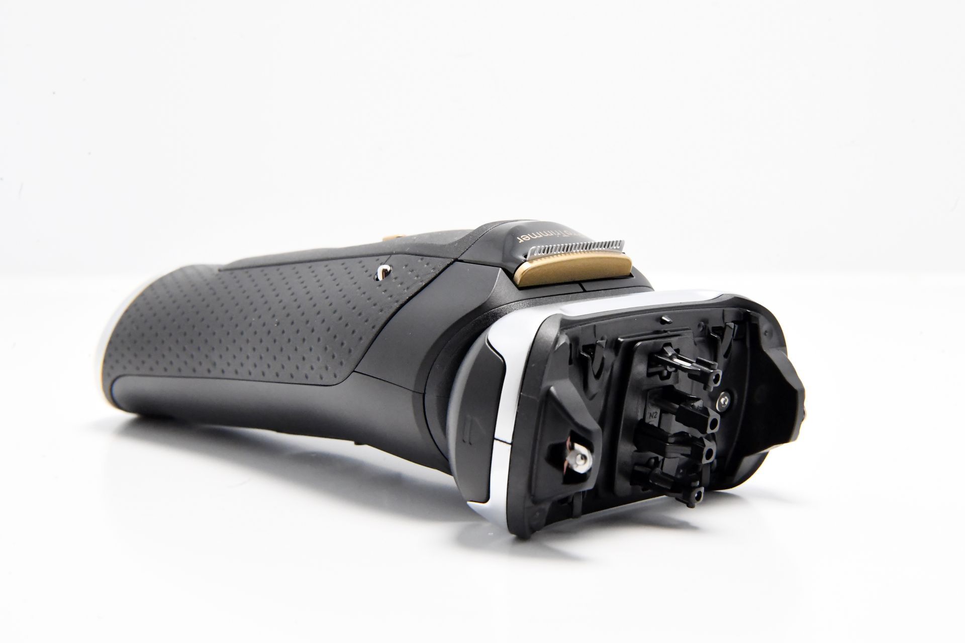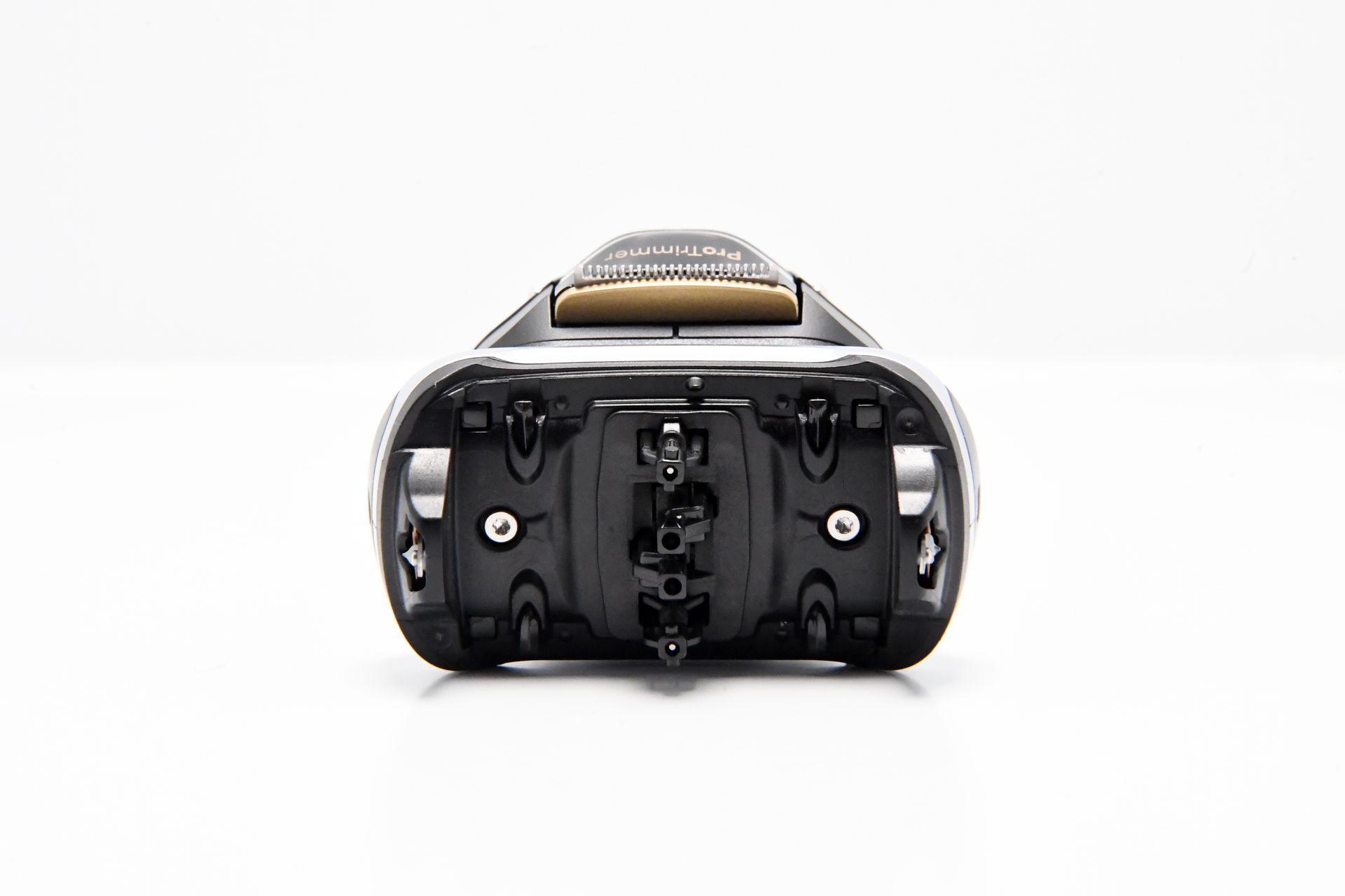 Auf der Rückseite befindet sich außerdem der Pro Trimmer, der speziell für die Vorbereitung des Bartes zum Trimmen entwickelt wurde. Der Trimmer lässt sich leicht mit einem goldenen Knopf entsichern und nach oben schieben, um den Bart auf die gewünschte Länge zu kürzen.