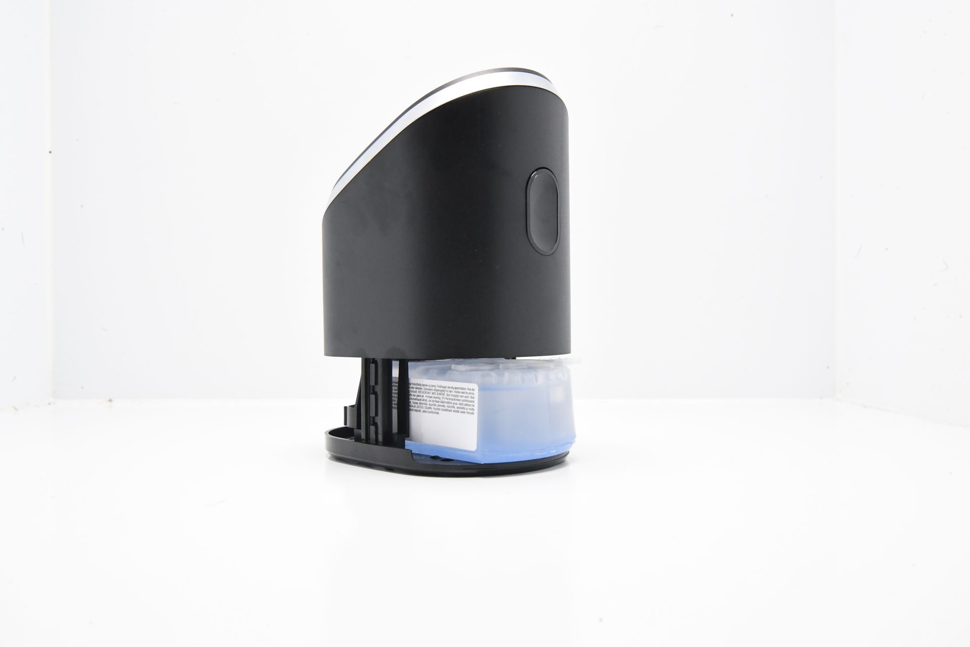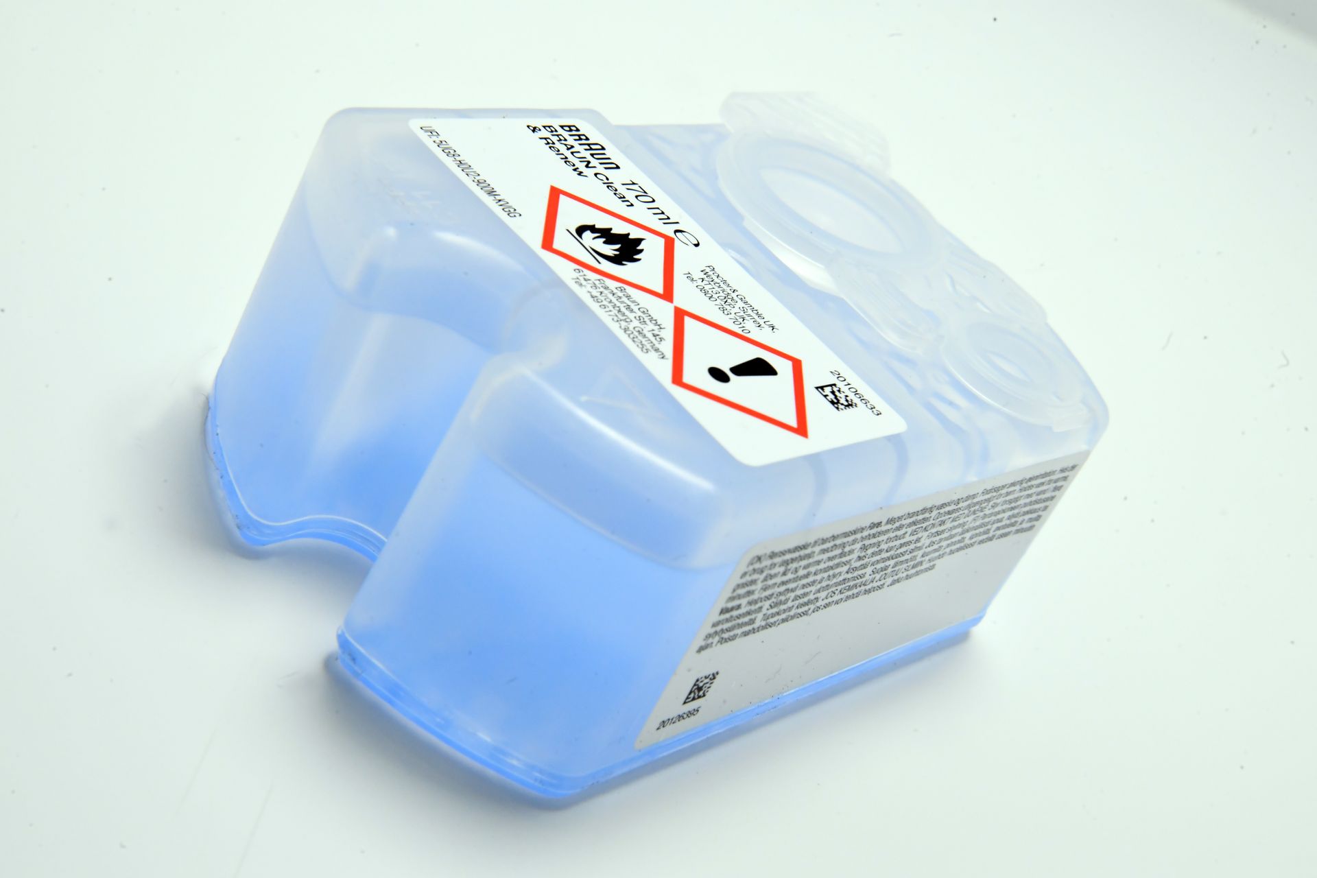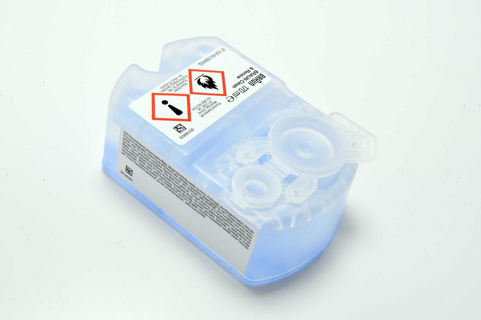 Über eine separate Reinigungsflüssigkeit wird der Rasierkopf automatisch gereinigt, wenn der Benutzer dies per Knopfdruck auswählt. Die Reinigungslösung besteht aus einer Mischung aus Alkohol, Wasser, Gleitstoffen und Duftstoffen, die zusammenwirken, um den Scherkopf effektiv zu säubern. Diese Flüssigkeit wird in einer speziellen Kartusche aufbewahrt, die aus zwei Kammern besteht. In der einen Kammer wird die Flüssigkeit aufbewahrt, während die andere Kammer für die Auffangung der gebrauchten Flüssigkeit sorgt.