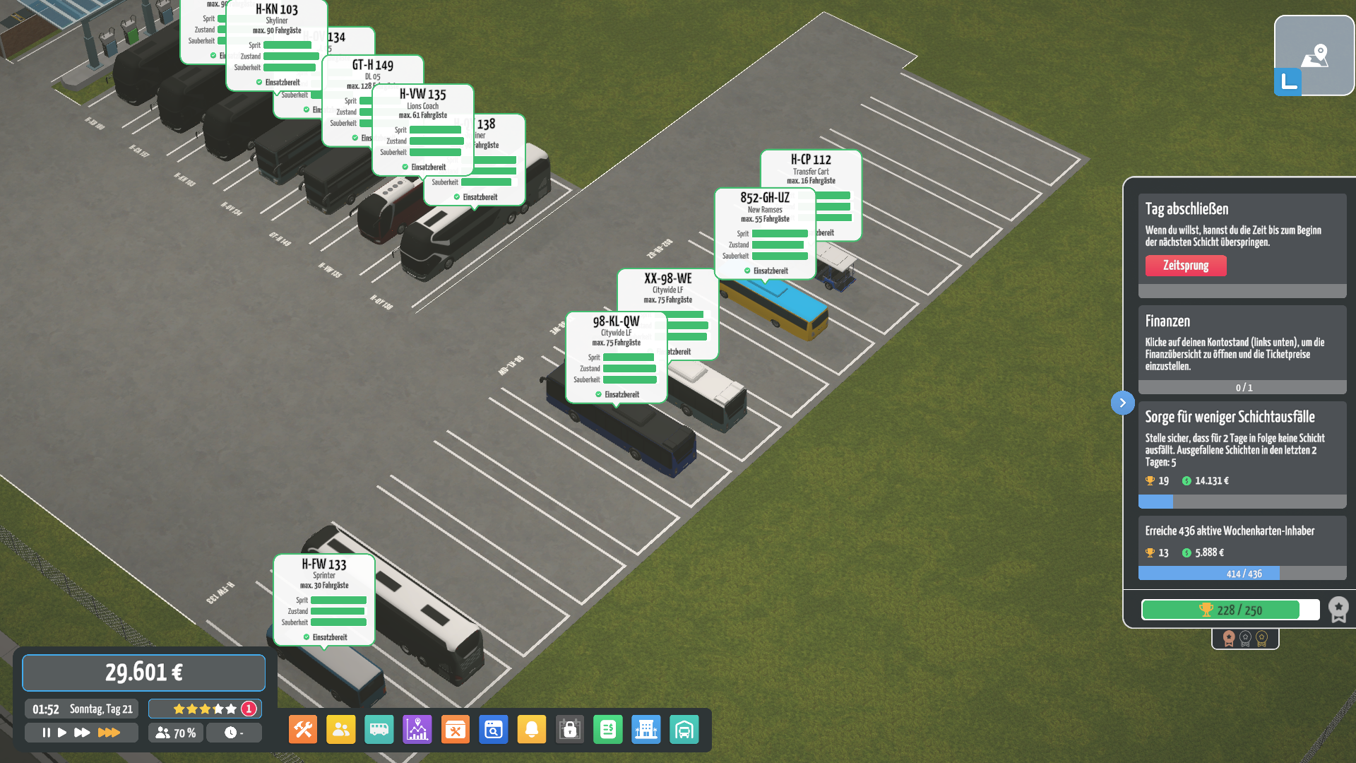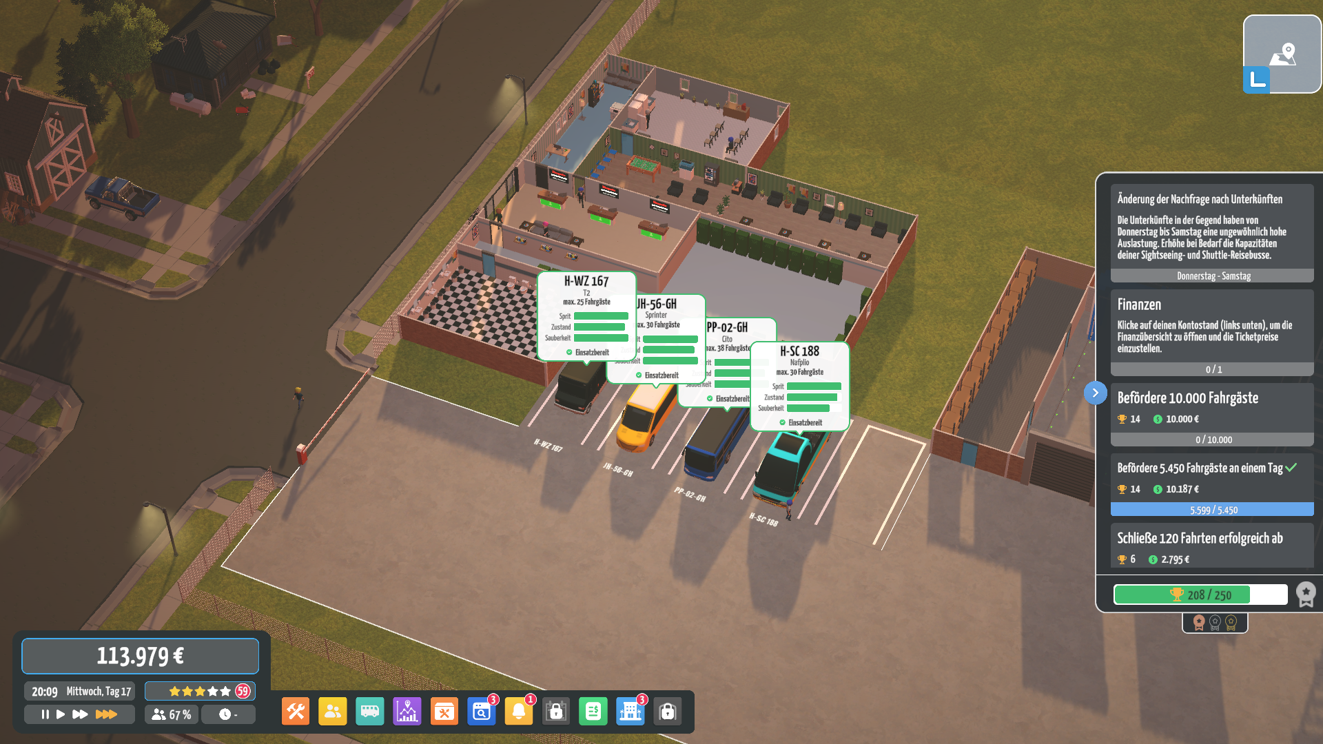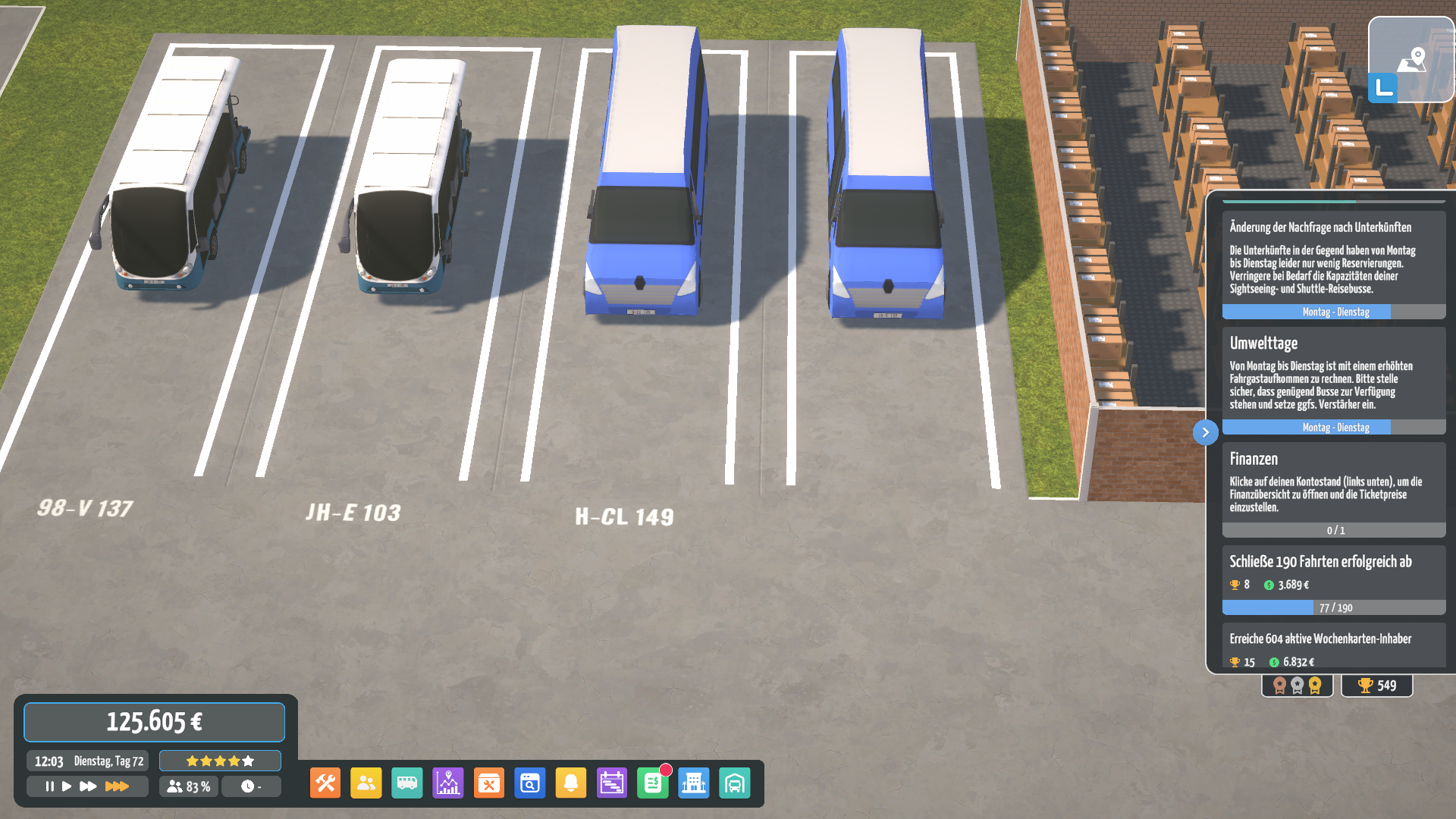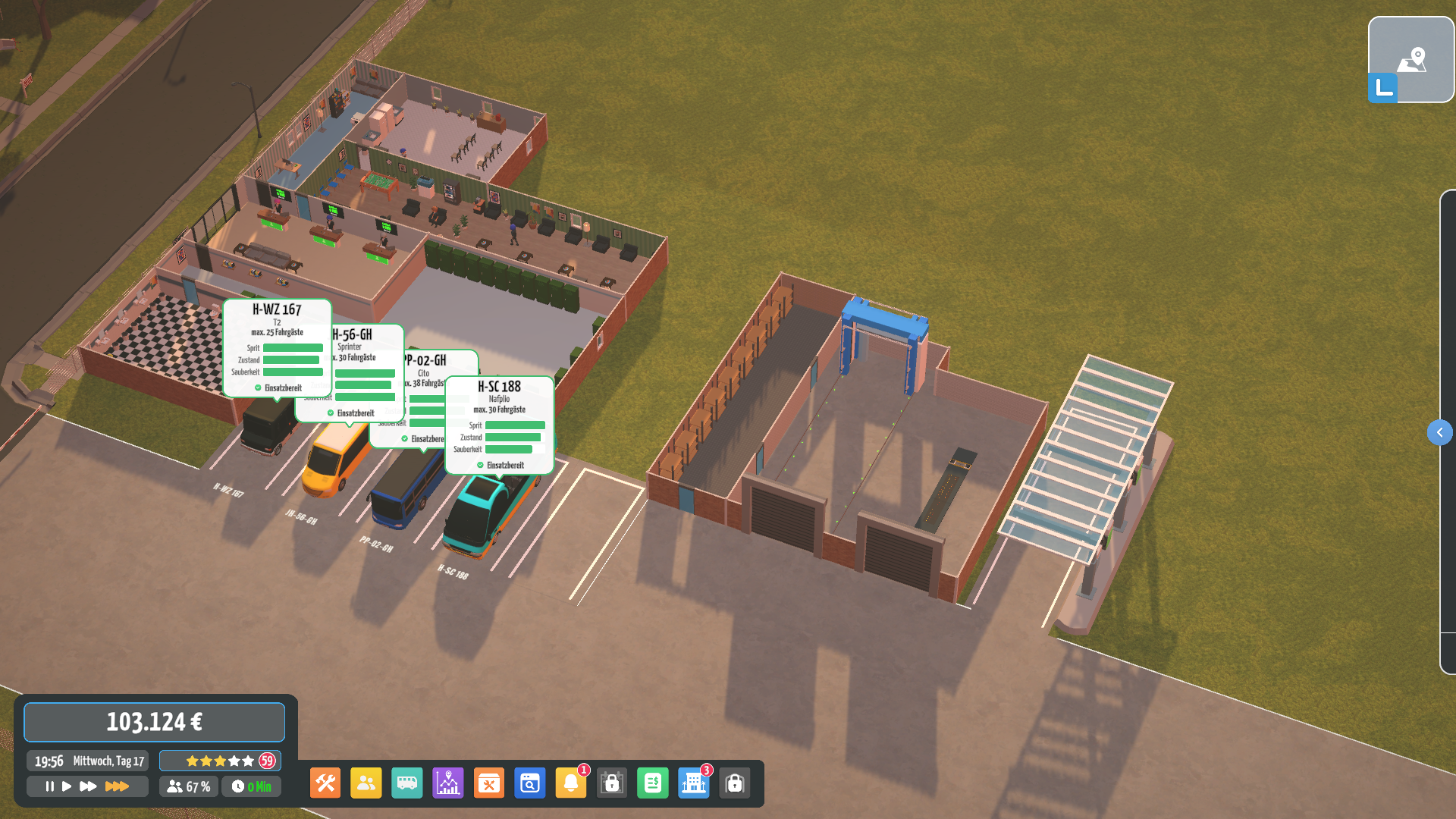 Ein weiteres interessantes Element ist der Bau und die Verwaltung des eigenen Busdepots. Das Depot ist der zentrale Hub, in dem alle Busse gewartet, repariert und gereinigt werden. Hier muss der Spieler entscheiden, welche Einrichtungen und Ressourcen er hinzufügt, um die Effizienz zu maximieren. Werkstätten, Waschanlagen und sogar Pausenräume für die Mitarbeiter sind notwendig, um einen reibungslosen Betrieb sicherzustellen.