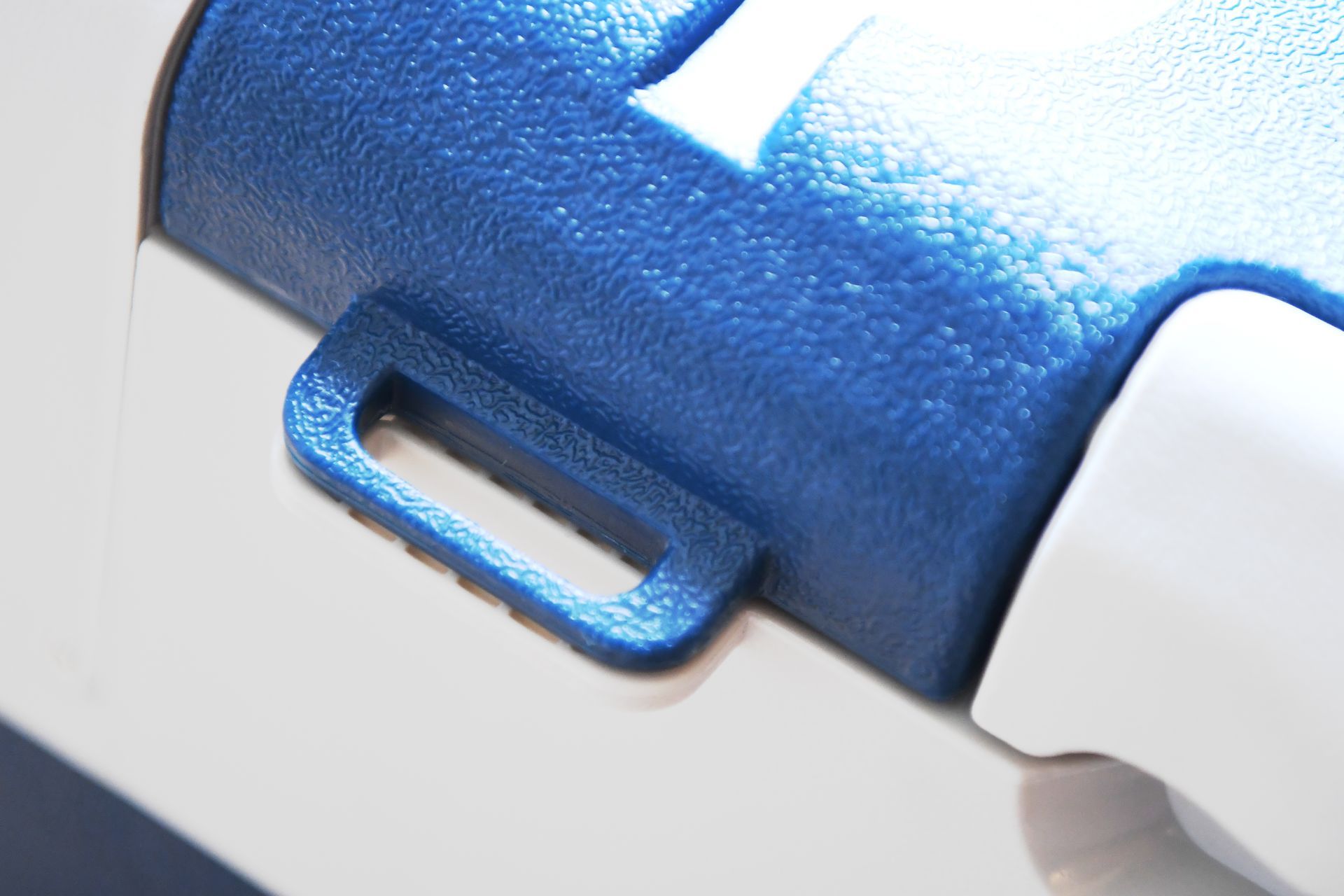Die Kühlbox ist mit einem ergonomischen Tragegriff ausgestattet, der den Transport angenehm macht. Der Griff ist robust, stufenweise höhenverstellbar und erinnert an moderne Rollkoffer. Dies sorgt nicht nur für eine bequeme Handhabung, sondern macht die Box auch extrem mobil – sowohl auf glatten Straßen als auch auf unebenen Oberflächen wie Schotter oder Rasen.