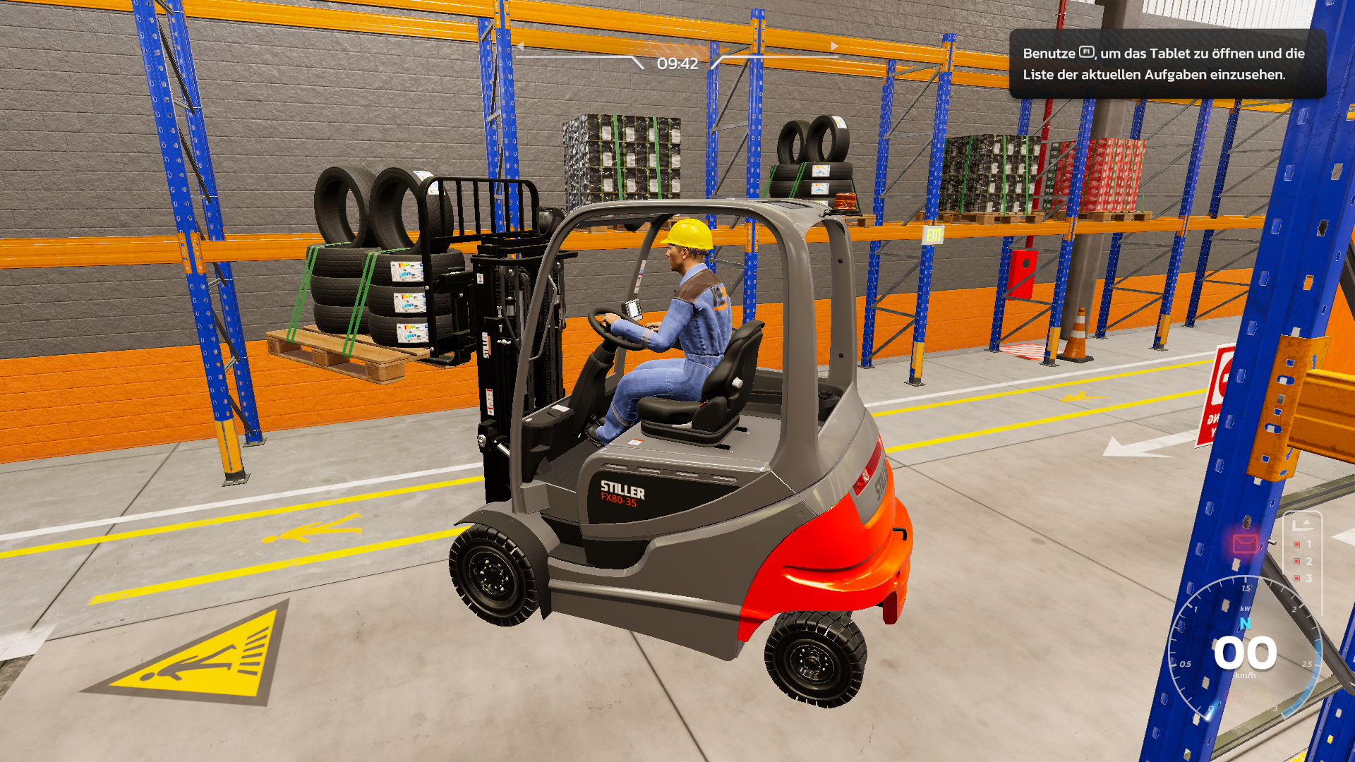 Die Steuerung ist fein abgestimmt: Von der Beschleunigung über das Lenken bis hin zur Hebefunktion der Gabeln – jede Bewegung muss wohlüberlegt sein. Der Spieler kann die Gabeln in der Höhe und Neigung präzise einstellen, um eine Palette sicher aufzunehmen und zu transportieren. Die Kameraperspektive lässt sich flexibel anpassen, was besonders bei komplexeren Aufgaben hilfreich ist, da man den Gabelstapler aus verschiedenen Winkeln beobachten kann.