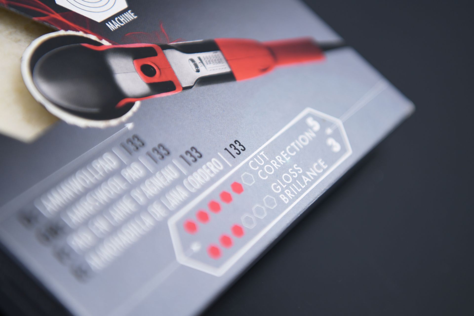 - Politurauftrag: Für die Bearbeitung von Kratzern und anderen Lackdefekten wird eine abrasive Politur empfohlen. Hierbei sollte die Politur gleichmäßig auf das Pad aufgetragen werden.