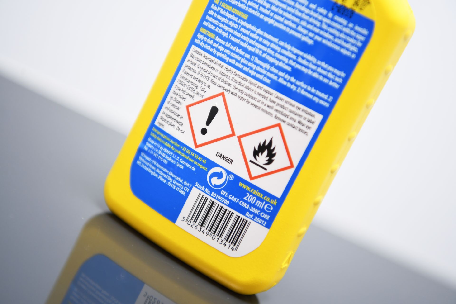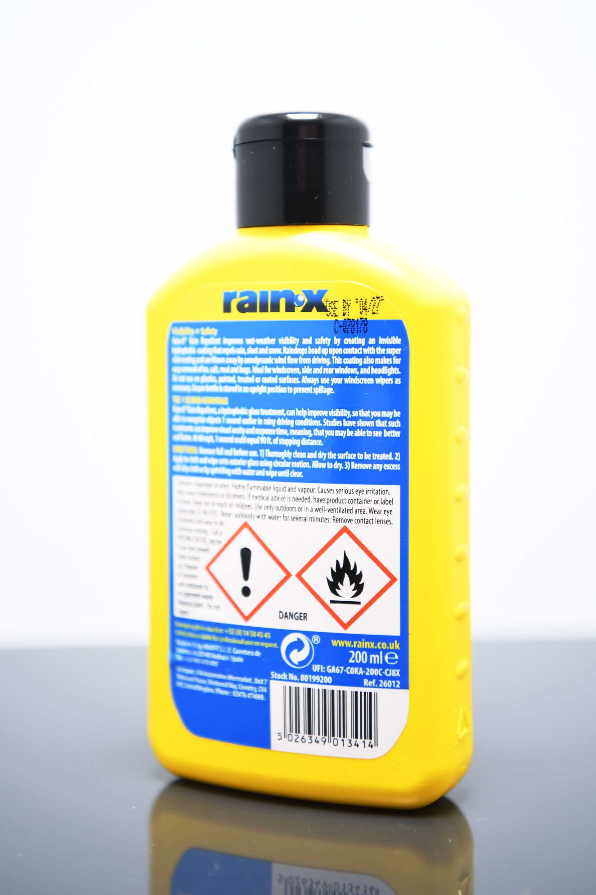 Wichtiger Hinweis: Rain-X enthält Chemikalien, die leicht entzündlich sind. Es sollte daher in gut belüfteten Bereichen angewendet werden, und es ist darauf zu achten, dass die Flüssigkeit nicht mit lackierten Oberflächen in Berührung kommt, da sie diese beschädigen könnte.
