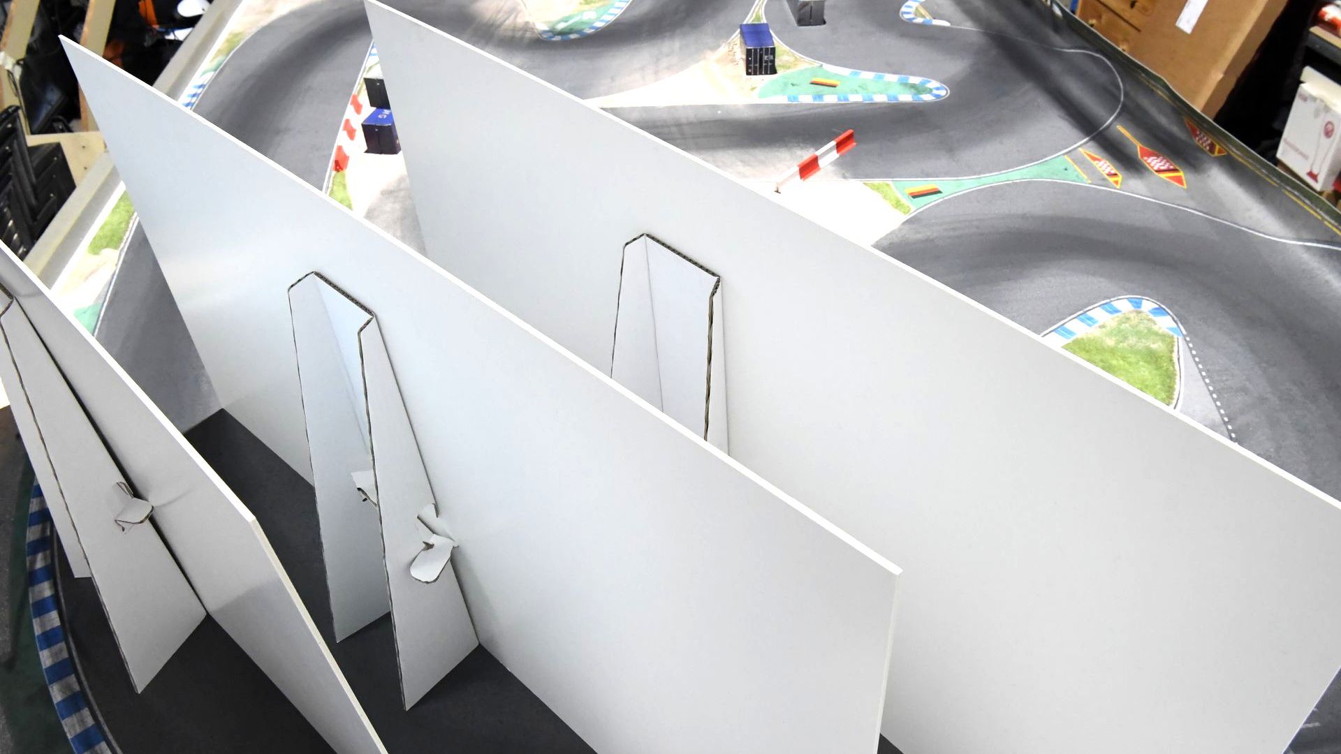 Um optimale Driftbedingungen zu schaffen, wurde der Untergrund mit eigens angefertigten Sandwichplatten vorbereitet, um etwaige Unebenheiten von Fliesen oder Laminat auszugleichen. Nutzer mit glattem Bodenbelag können auf diesen Schritt verzichten, denn die Strecken sind auch solo voll funktionsfähig.